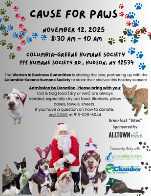 The Women In Business Committee of the Columbia County Chamber of Commerce is partnering up with Columbia-Greene Humane Society and having a breakfast holiday soiree to help our four-footed friends and their shelter needs!